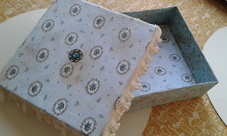 Deze doos moest eerst wit geschilderd worden, daarna met stof bekleven en met een kantje afwerken. Om de doos oud te maken gebruikten we patina, en schuurpapier.